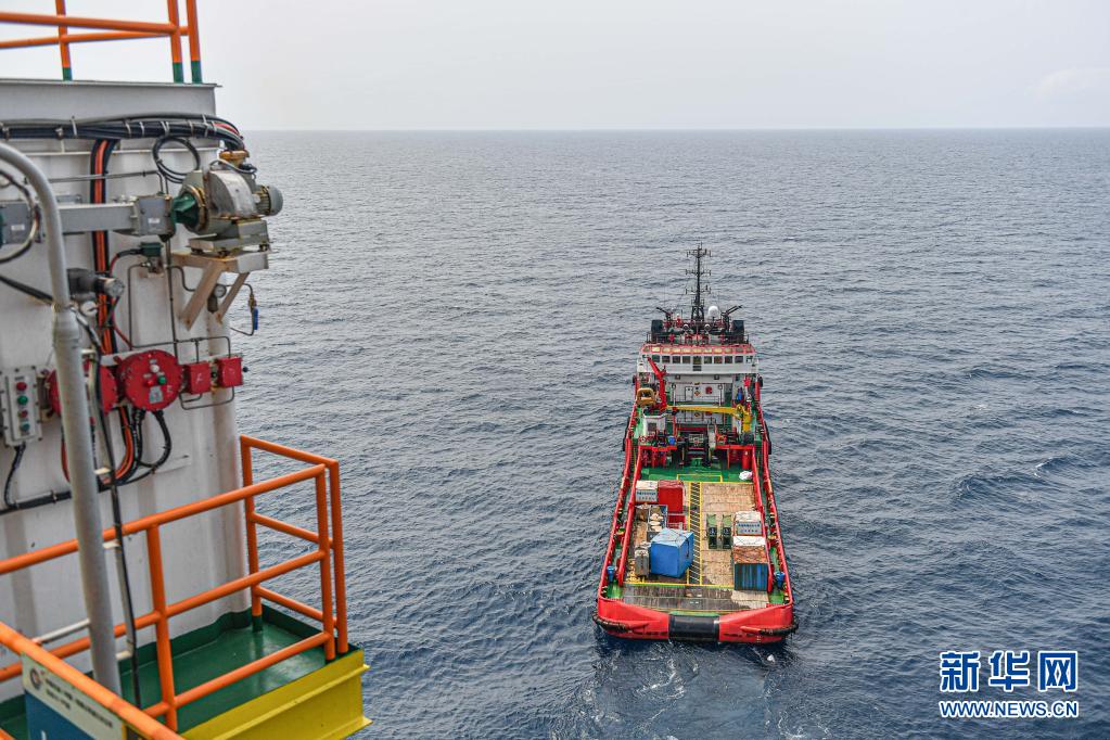 這是4月25日在南海北部海域拍攝的為中國海油樂東15-1氣田運送物資的拖船。