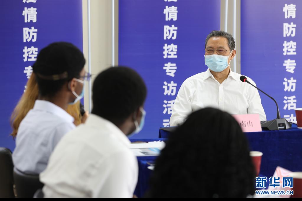 2020年4月15日,廣州市人民政府新聞辦公室在廣州醫(yī)科大學(xué)舉辦廣州市第78場疫情防控新聞采訪活動(dòng),鐘南山與在穗工作學(xué)習(xí)的外籍人士代表進(jìn)行座談交流。新華社記者 李嘉樂 攝