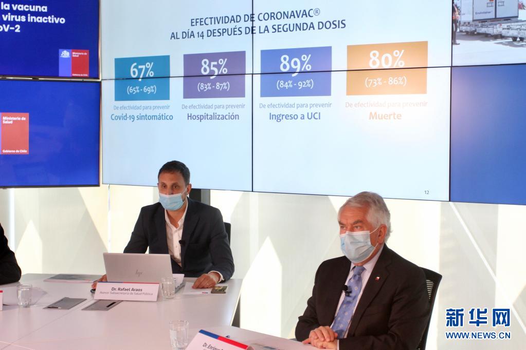 4月16日,智利衛(wèi)生部長帕里斯(右)與智利衛(wèi)生部顧問阿勞斯在圣地亞哥出席發(fā)布會,公布中國科興新冠疫苗保護(hù)效果在該國的真實(shí)世界研究結(jié)果。新華社發(fā)(智利衛(wèi)生部供圖)