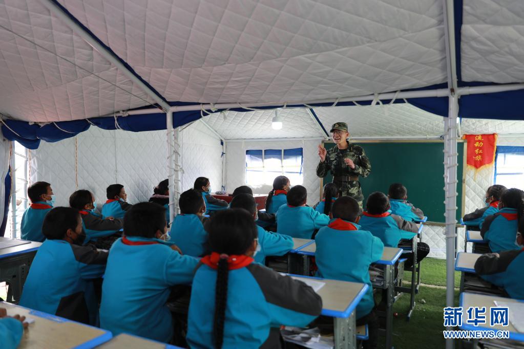 5月24日,武警青??傟?duì)果洛支隊(duì)機(jī)動大隊(duì)排長張國睿為花石峽鎮(zhèn)藏文中心寄宿制小學(xué)的孩子上課。新華社記者 劉新 攝