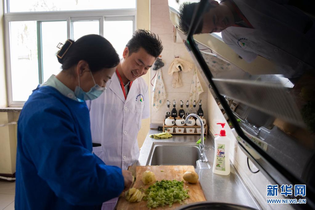 在太原市社會(兒童)福利院,黨龍祥(右)在廚房查看孩子們的輔食準備情況(5月26日攝)。新華社記者 楊晨光 攝