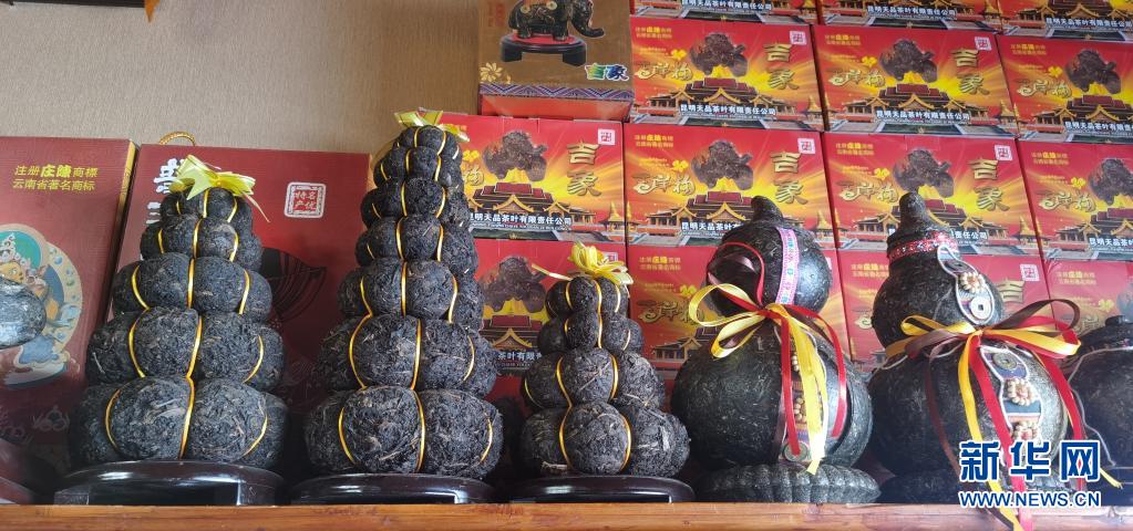 在位于西藏拉薩的一家茶葉公司的門店內(nèi)擺放著造型獨特的茶葉制品(4月23日攝)。新華社記者 張京品 攝