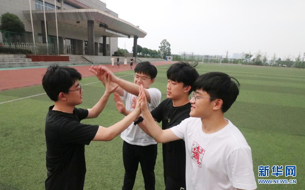 6月9日,在湖南省婁底市第四中學(xué),四胞胎兄弟在高考后擊掌,慶祝順利完成考試。