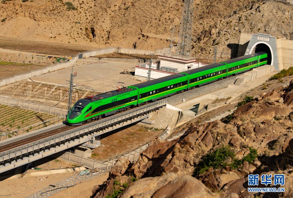 試運行的復(fù)興號列車駛出拉林鐵路的嘎拉山隧道(6月16日攝)。