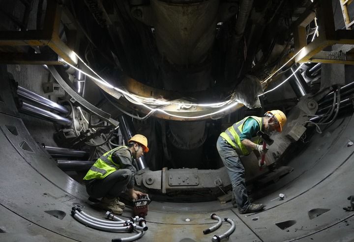 中铁十八局集团工人在石家庄市地铁5号线一期工程01工区建设工地施工(2025年10月24日摄)。新华社记者 杨世尧 摄
