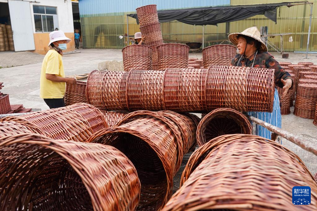6月6日,临沭县青云镇西朱崔村居民在加工点生产柳编产品。