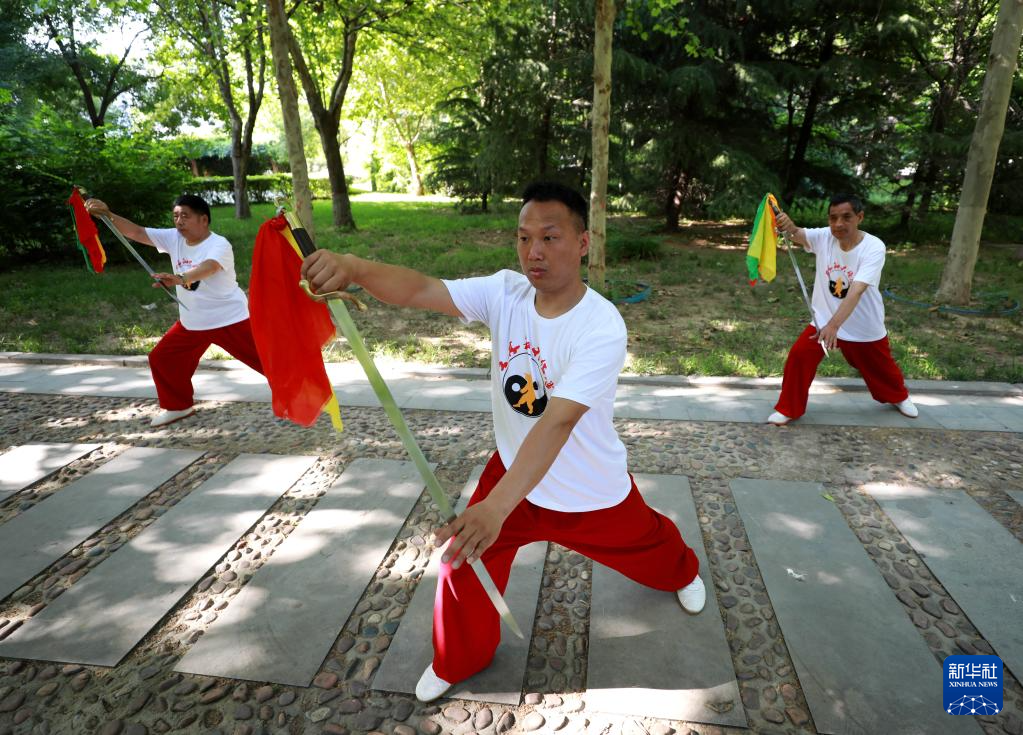 6月9日,太极拳爱好者在河北省邢台市任泽区人民广场展示王其和太极拳器械太极刀。