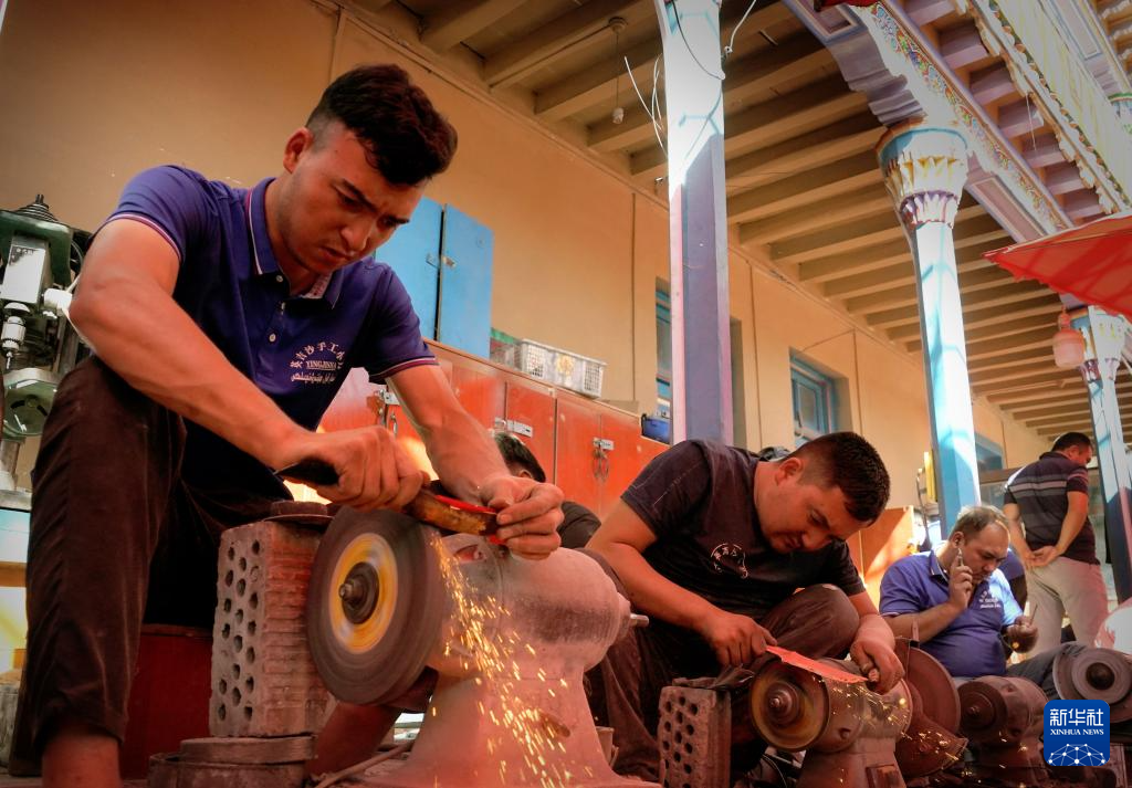新疆喀什地区英吉沙县拥有众多非物质文化遗产项目,其中维吾尔族传统小刀制作技艺和维吾尔族模制法土陶烧制技艺等为国家级非物质文化遗产。近年来,英吉沙县依托非遗资源,在文化润疆进程中传承发展民族传统特色手工业,打造非遗产业新业态、新动能,助力乡村振兴。
