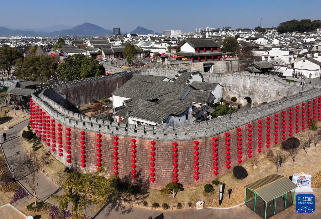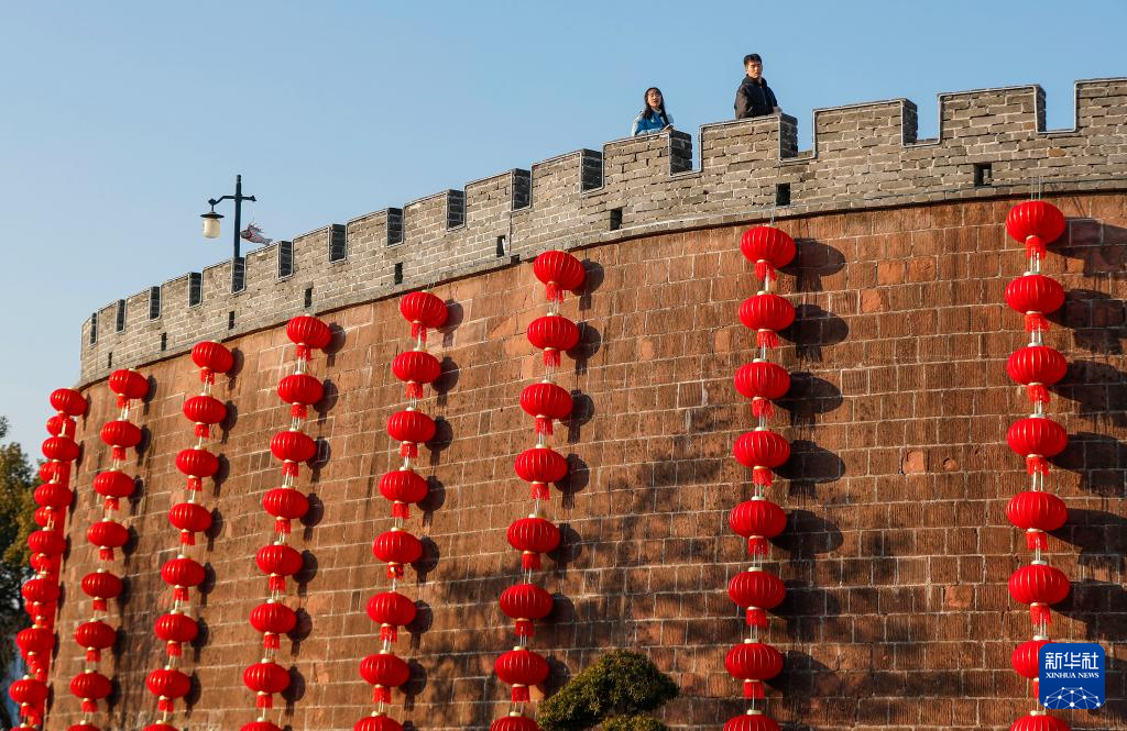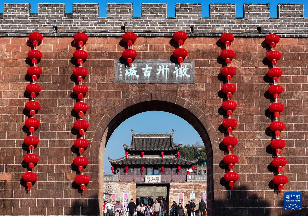 春节临近,安徽省黄山市歙县徽州古城挂起串串大红灯笼,洋溢着喜庆红火的节日氛围。