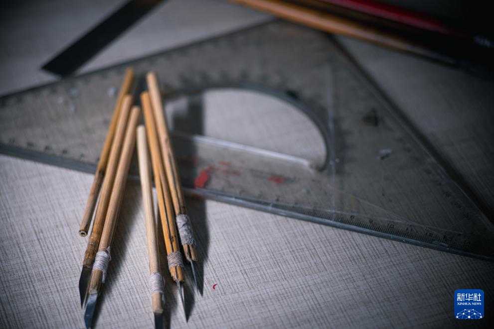这是卢发良创作细纹刻纸所运用的部分工具(3月12日摄)。