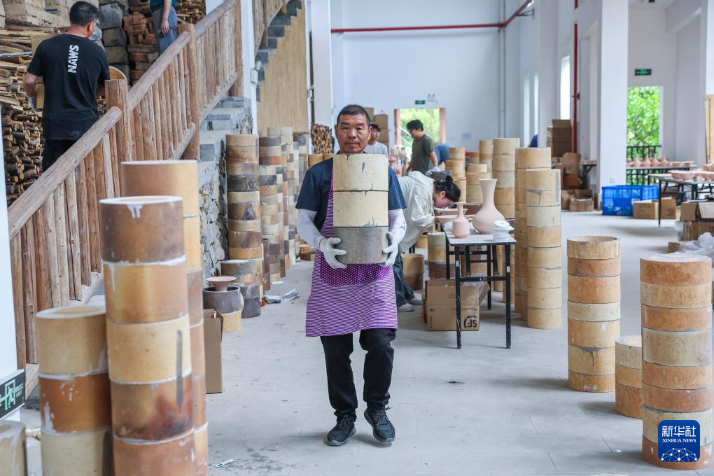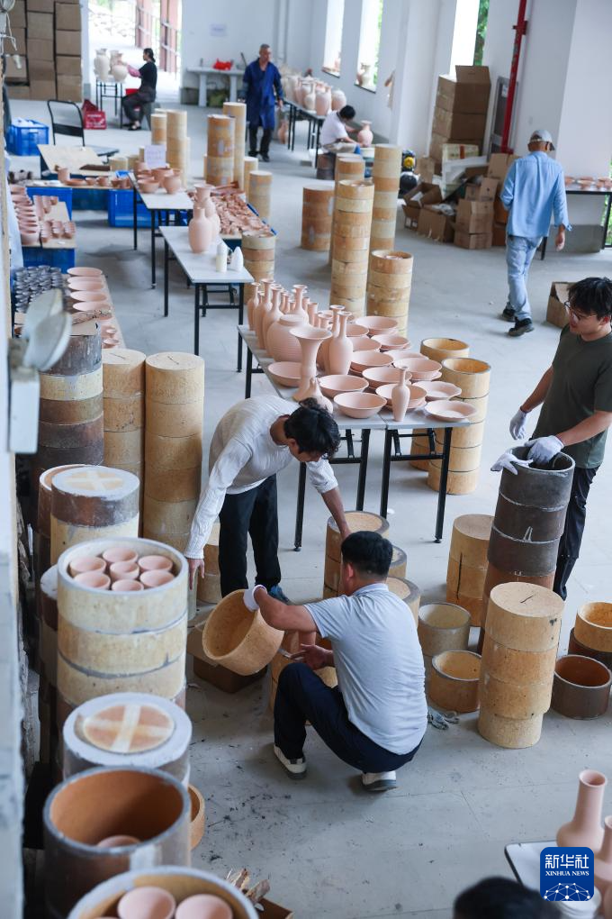 5月29日,工作人员整理即将放入龙窑烧制的不同器型的瓷坯。