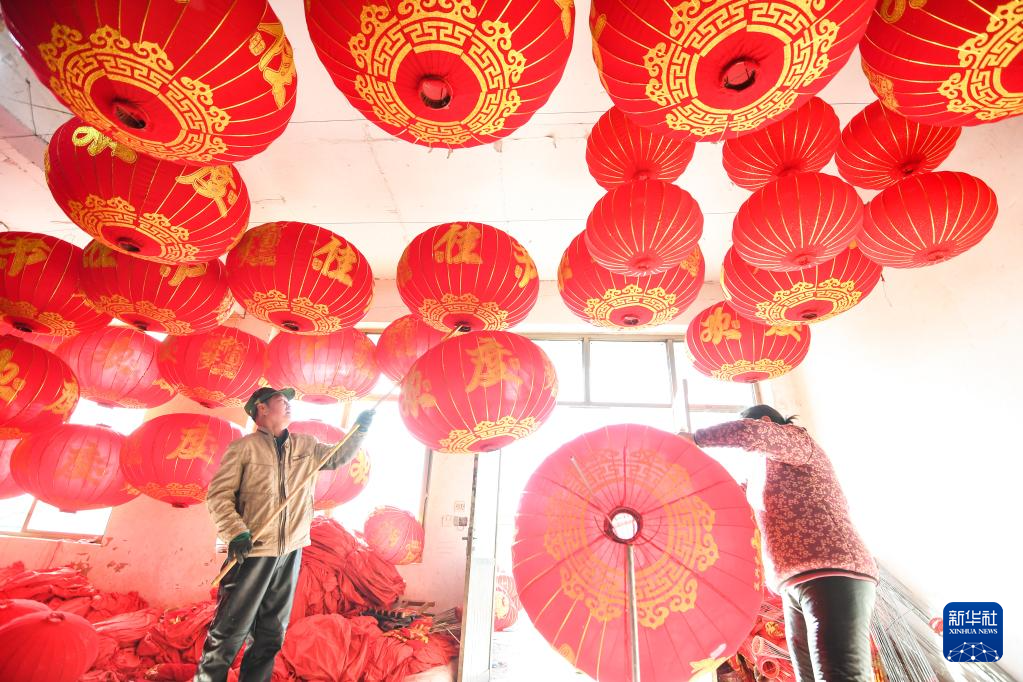 12月16日,在河北省石家庄市藁城区梅花镇屯头村一家宫灯生产厂,工人在晾晒宫灯。