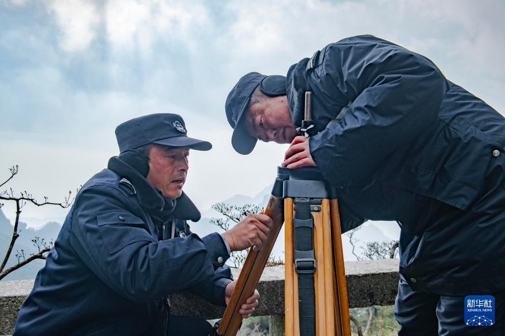 12月18日,黄山风景区管委会园林局瞭望哨防火小队队长秦志平(右)和同事在平天矼瞭望哨外组装望远镜。