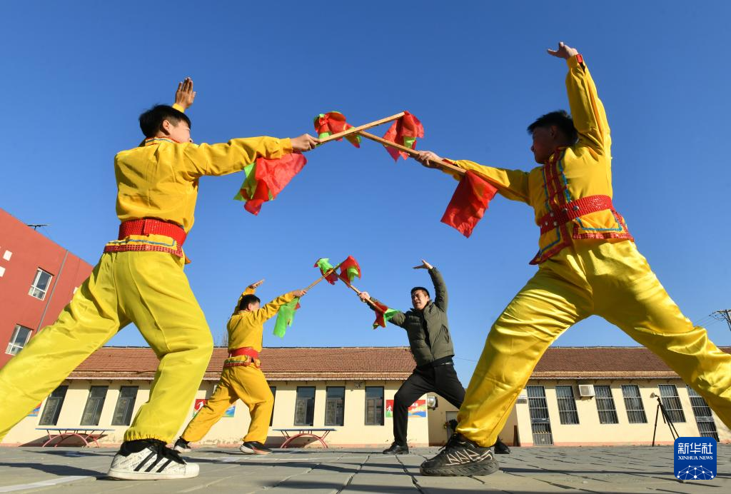 12月22日,在南皮县冯家口镇车官屯小学,沧州落子第六代传承人张洪通(前右)在指导学生练习沧州落子。