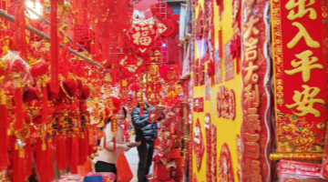 随着农历蛇年临近,广东省深圳市各大年货市场被新年饰品装扮一新,大红灯笼、春联、年画和中国结等春节饰物吸引众多市民前来选购。