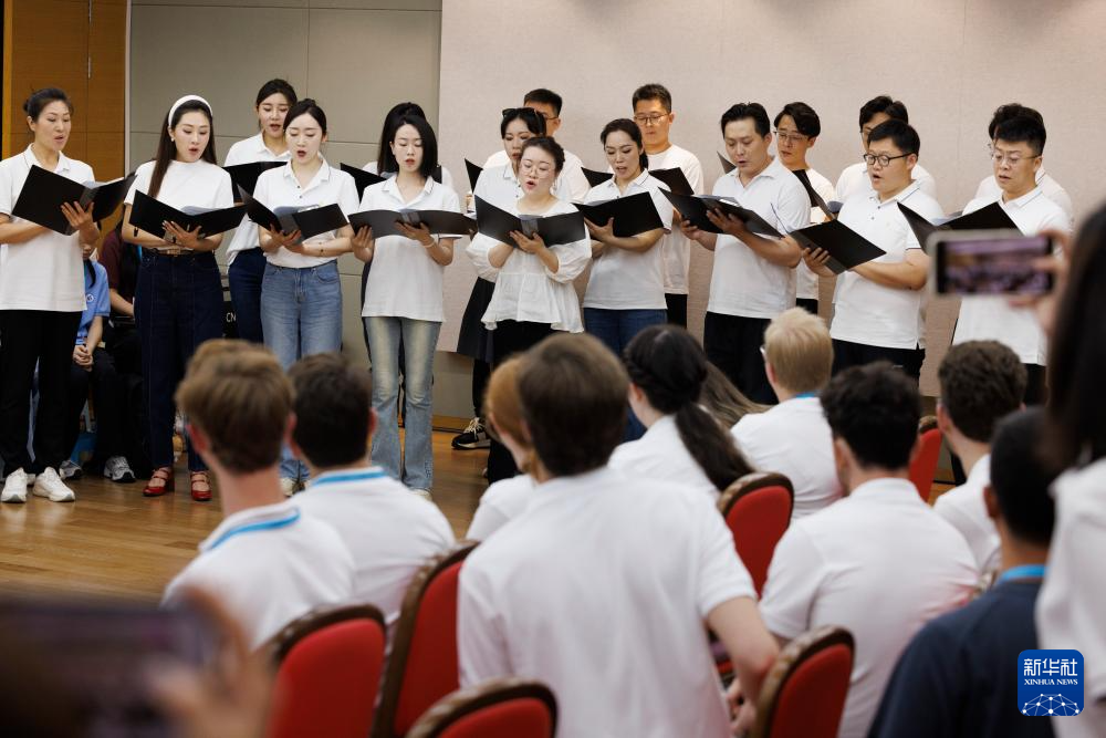 7月14日,在中国交响乐团,河北省正定中学合唱团团员与犹他谷大学合唱团团员交流。