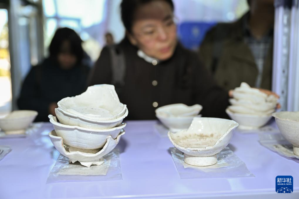 考古学家们在苏峪口瓷窑址考古队文物库房内对出土瓷器进行考察(10月13日摄)。