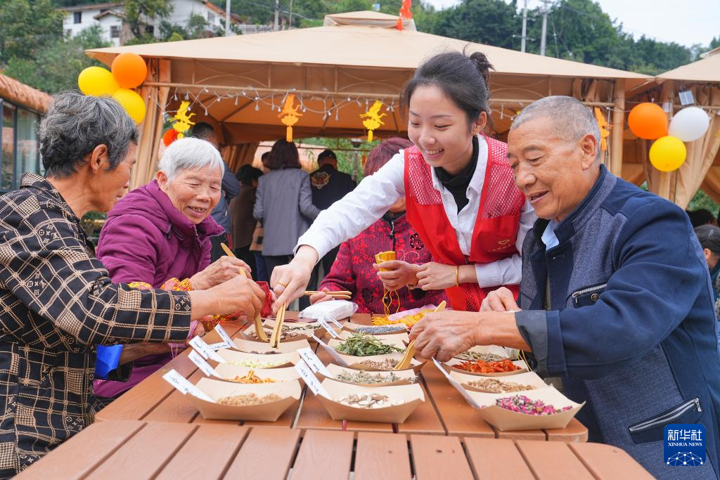 10月27日,在重庆市北碚区水土街道三元桥村,志愿者和老人们一起制作香囊。