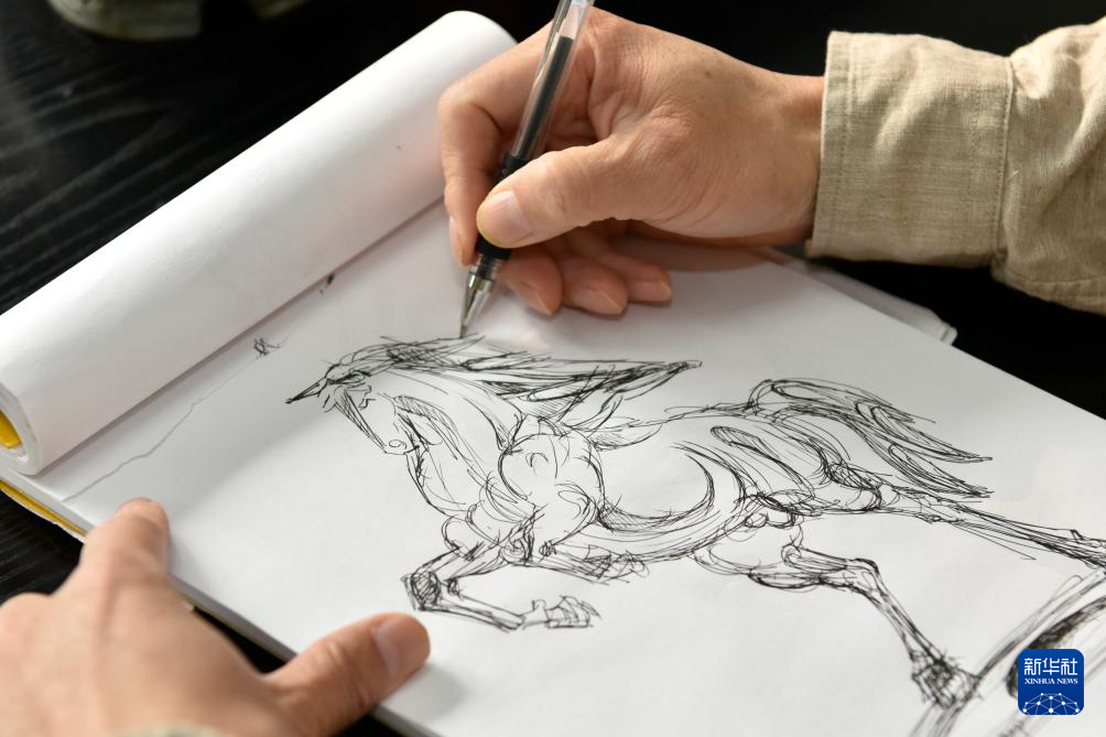 10月27日,郑东平在位于铜陵市的工作室内绘制铜工艺品线稿。