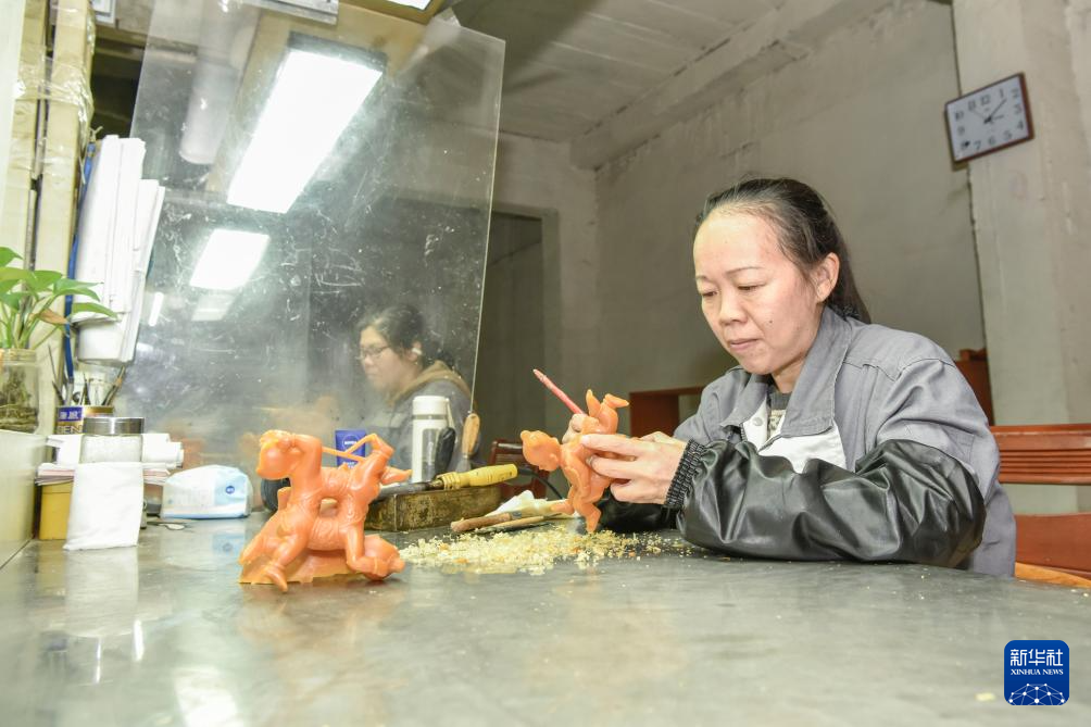 10月29日,安徽铜陵一家铜器制作企业的铜艺工人在修蜡模。