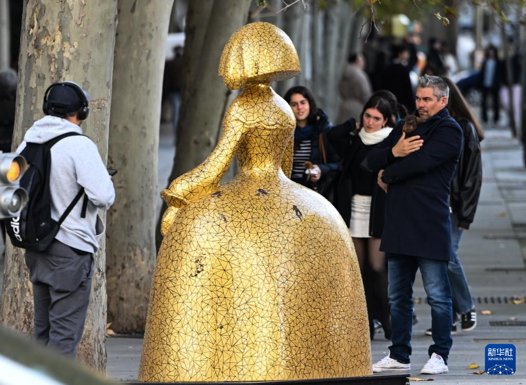 这是11月19日在西班牙马德里街头拍摄的“宫娥”主题雕塑。