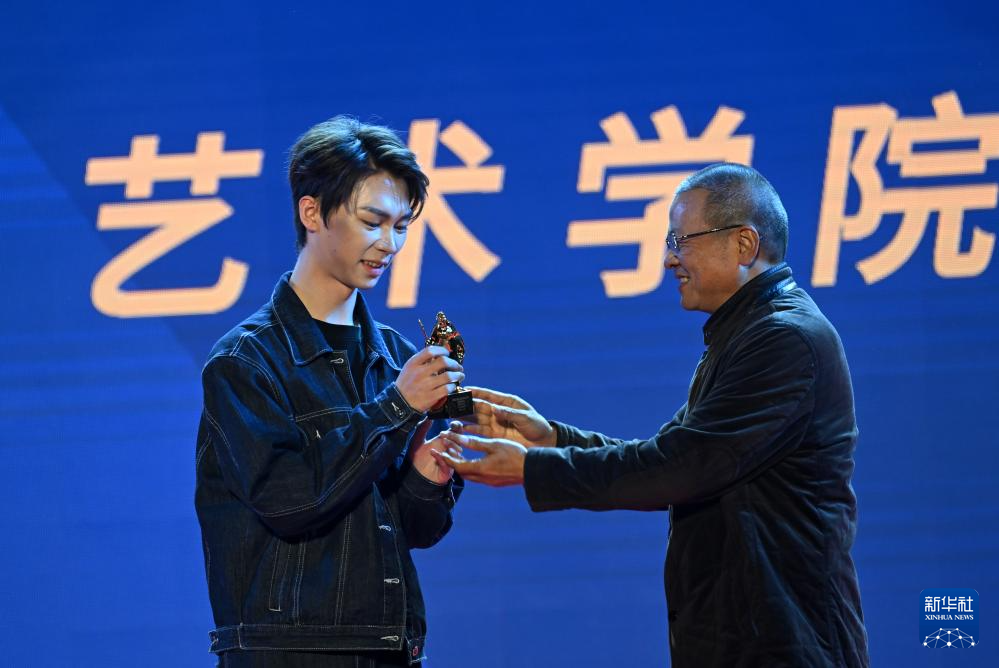 11月22日,北京戏剧家协会副主席王宝社(右)为获得微短剧单元“微短剧之星”的西南民族大学《狮·心》剧组代表颁奖。