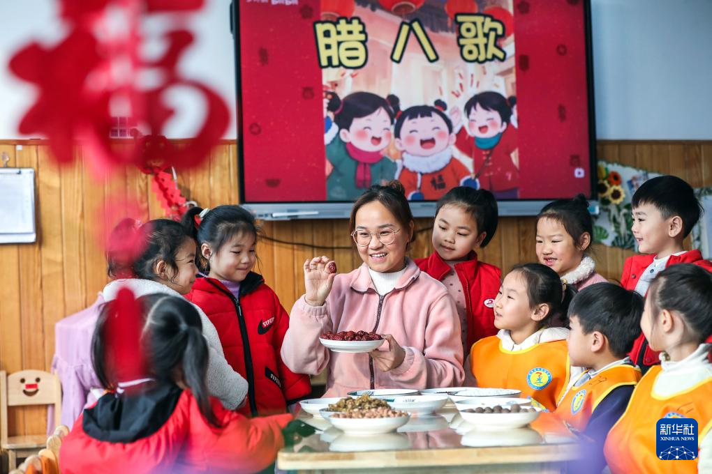 1月26日,在河南省济源市第一幼儿园,老师教小朋友们辨认制作腊八粥的食材。