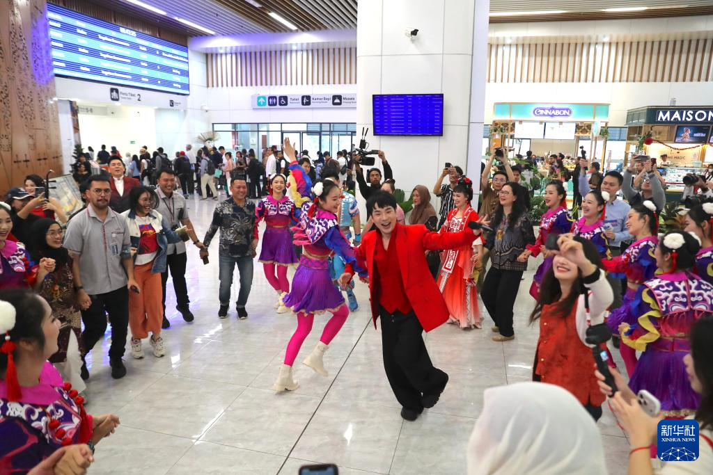 来自广西歌舞剧院、广西戏剧院的演员2月4日在印度尼西亚雅加达雅万高铁哈利姆站上演“马上有福”城市快闪活动,传递浓厚的农历春节气氛。