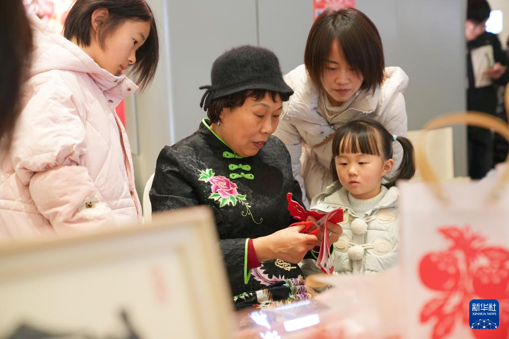 2月10日,在徐州东站,旅客在徐州剪纸摊位前欣赏剪纸作品。