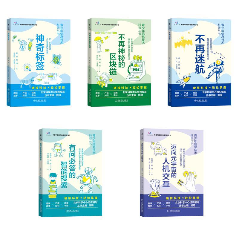 今年4月,教育部出台了《义务教育信息科技课程标准(2022版)》,将信息科技内容的学习正式纳入我国小学和初中生的必修课。但是,各地普及信息科技教育的基础条件还存在着发展不平衡、不充分等问题。因此,相关科普资源的开发特别是原创科普书籍的创作既能满足学生信息科技课堂学习所激发出的求知欲,又能在一定程度上缩小不同地区、学校资源供给不足和条件差异所带来的数字鸿沟。为此,机械工业出版社与北京科学中心联合推出了“青少年信息技术科普丛书”,包括《神奇标签》《不再迷航》《不再神秘的区块链》《有问必答的智能搜索》和《迈向元宇宙的人机交互》五册。丛书由北京科学中心组织编写,教育部义务教育信息科技课程标准研制组组长熊璋担任主编,由高校教师、科技馆科普教师、美术教师和中小学信息科技骨干教师等组成的编写团队历时三年多创作完成。“青少年信息技术科普丛书”入选信息科技是与人们生产生活联系最为密切、发展最为迅猛的前沿科技领域之一,也对广大青少年的思维、学习、社交、生活方式产生了深刻影响,在给他们数字化学习生活带来便利的同时,电子产品使用过量过当、信息伦理与安全等问题已成为全社会关注的话题。如何把对数码产品的好奇心的转变为探索知识的动力,培养和激发青少年探索信息科技背后秘密的兴趣,适应在线社会的使命感和从容感是提升公民数字素养中的重要一环。但是内容新、成套系、符合青少年认知特点的信息技术科普图书尚比较缺乏,该丛书的创作出版有望填补此方面科普资源和内容的空白。