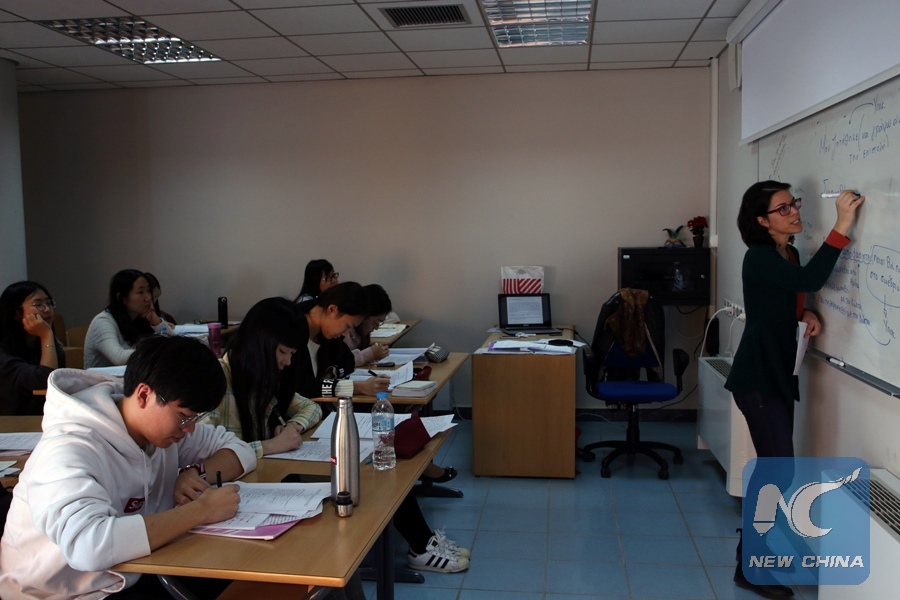 Photo taken on Dec. 15, 2017 shows Chinese students attending a class at the Modern Greek Language Teaching Center of the National University of Athens in Athens, Greece. The National University of Athens warmly welcomed the first ever group of Chinese students to learn the Greek language, history and culture as part of joint efforts of Greece and China in recent years to bring the two peoples closer. (Xinhua/Marios Lolos)