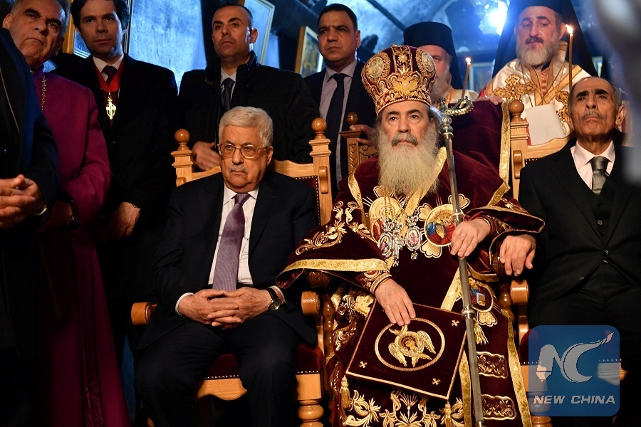 Palestinian President Mahmoud Abbas and the Greek Orthodox Patriarch of Jerusalem Theophilos III attend an Orthodox midnight mass at the Church of the Nativity in the West Bank town of Bethlehem, January 6, 2018. Picture taken January 6, 2018. (Reuters Photo)