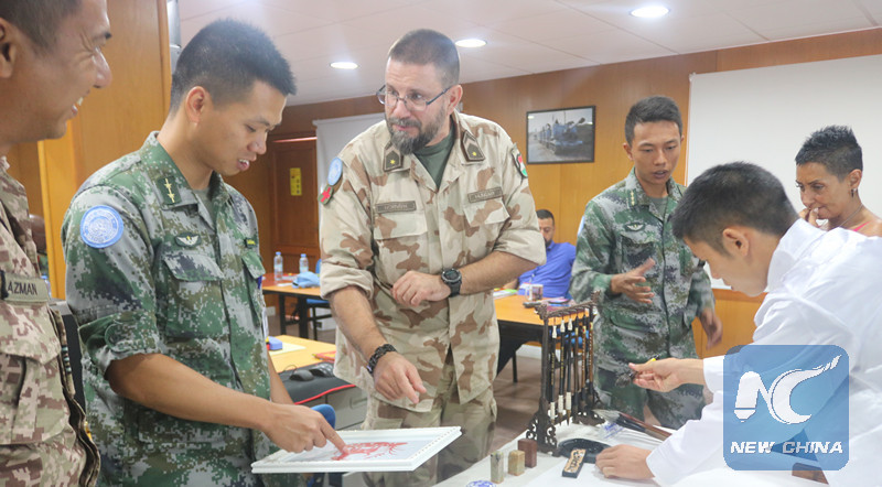 Military personnel of the United Nation Interim Force in Lebanon (UNIFIL) are learning Chinese traditional calligraphy and paper-cutting in Chinese language course on Aug. 23, 2018 at the headquarter of UNIFIL in Beirut. (Xinhua)