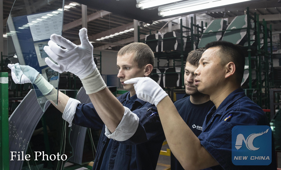 Chinese and Russian workers work at an automobile-level float glass production line in the Russian factory of China's Fuyao Glass Industry Group Co. in Kaluga, Russia, July 18, 2017. (Xinhua/Wu Zhuang)