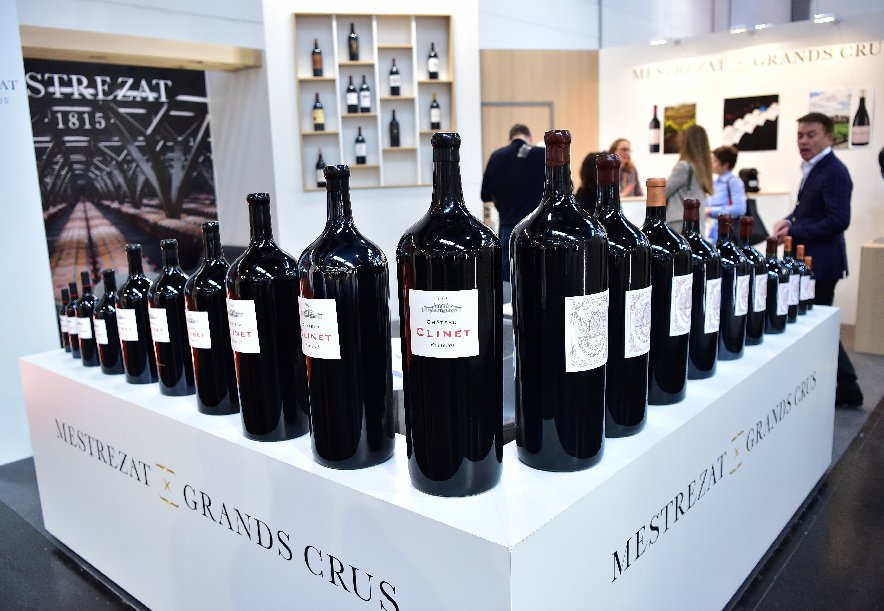 Exhibits of wines brewed by France-based Chateau Clinet are seen at the Prowein in Dusseldorf, Germany, on March 17, 2019. (Xinhua/Lu Yang)