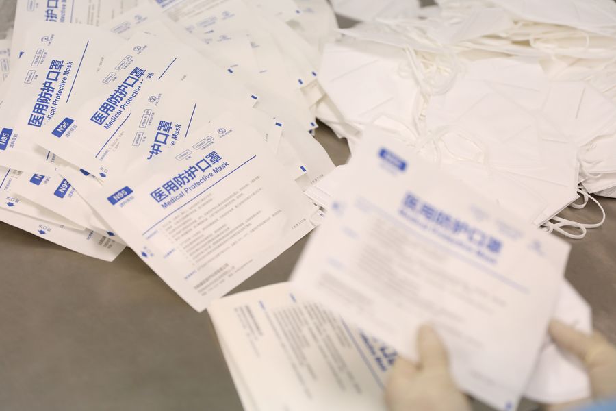 A worker packages medical N95 masks at a mask production company in Shenyang, capital of northeast China's Liaoning Province, Feb. 8, 2020. (Xinhua/Yao Jianfeng)