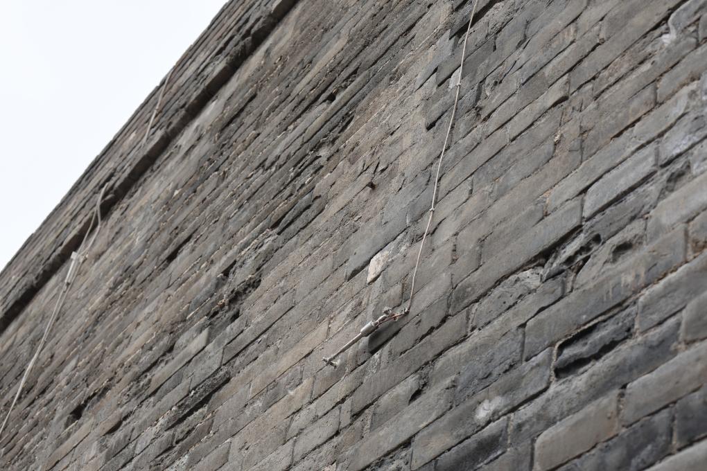 An inspector measures the length of a crack on Xi'an City Wall in Xi'an, northwest China's Shaanxi Province, Sept. 10, 2025. (Xinhua/Zhu Weixi)