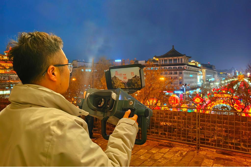 Zhao Bin tests an AR telescope gadget on the Xi'an City Wall in Xi'an, northwest China's Shaanxi Province, Jan. 4, 2026. (Xinhua)