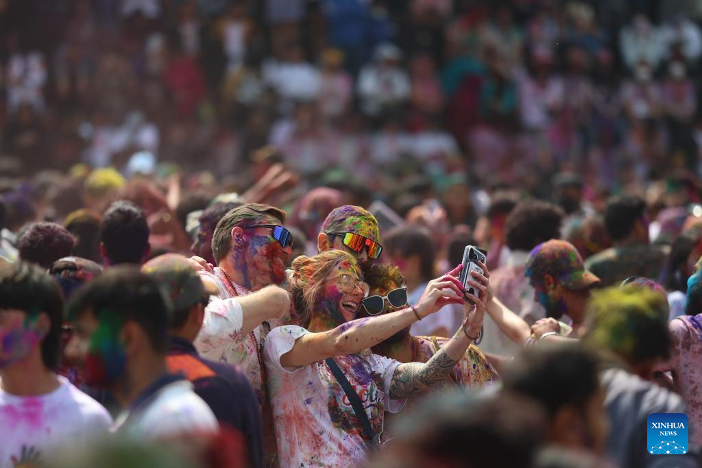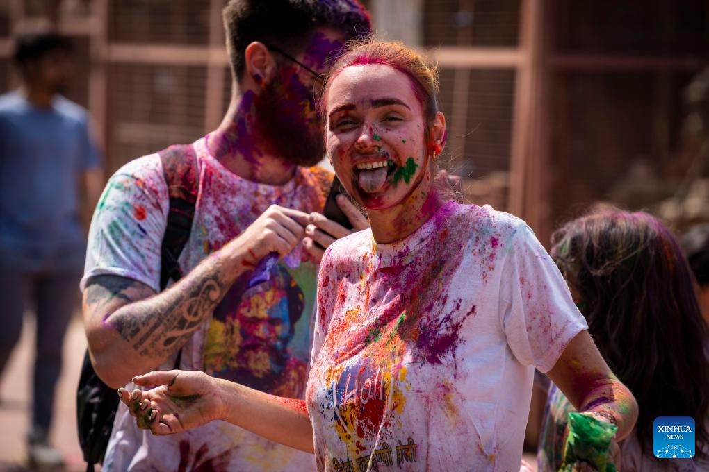People smeared with colored powder are pictured during a celebration of the Holi Festival in Kathmandu, Nepal, on March 2, 2026. Holi, the festival of colors, marks the end of winter and the onset of the spring season. (Photo by Sulav Shrestha/Xinhua)