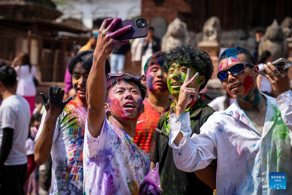 People smeared with colored powder are pictured during a celebration of the Holi Festival in Lalitpur, Nepal, on March 2, 2026. Holi, the festival of colors, marks the end of winter and the onset of the spring season. (Photo by Hari Maharjan/Xinhua)
