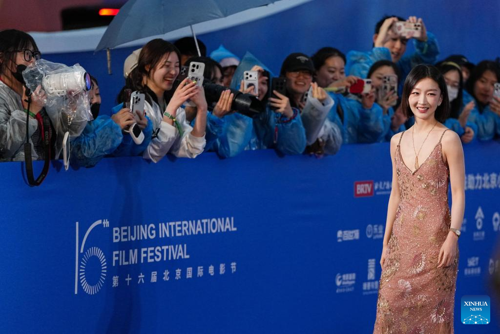 Actress Zhou Dongyu appears on the red carpet of the 16th Beijing International Film Festival (BJIFF) in Beijing, capital of China, April 16, 2026. The 16th BJIFF kicked off at the Yanqi Lake International Convention & Exhibition Center here on Thursday. (Xinhua/Ju Huanzong)