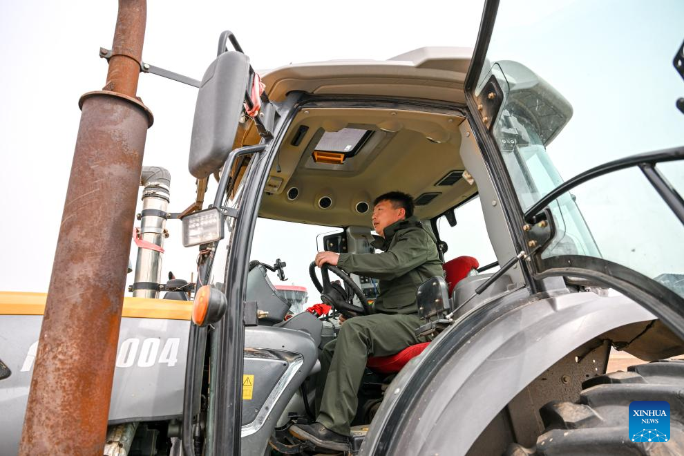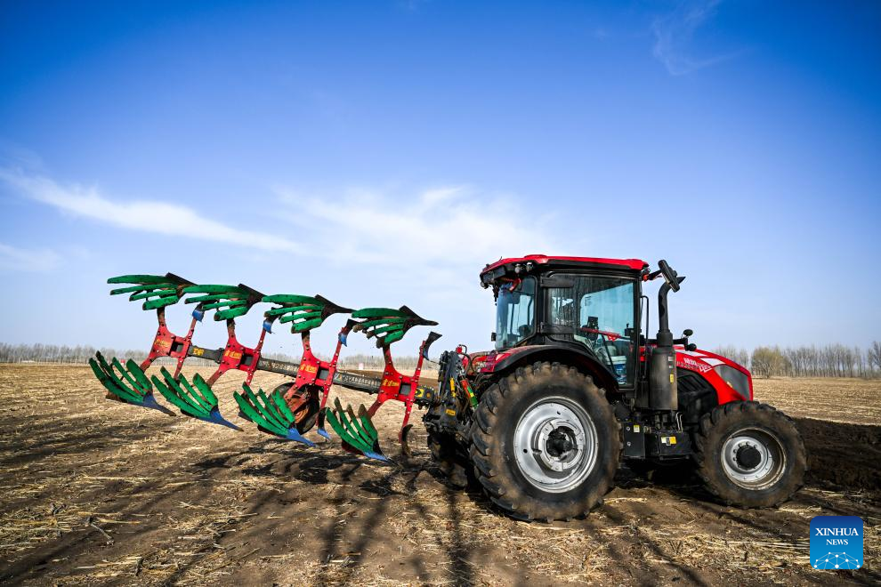 A farmer drives agricultural machinery to plough the fields in Horqin Left Wing Rear Banner of Tongliao City, north China's Inner Mongolia Autonomous Region, April 19, 2026. The ploughing work in Tongliao, a granary of eastern Inner Mongolia, is drawing to a close ahead of the peak period of corn sowing. It is learned that Tongliao's corn planting area in 2026 is expected to reach 20 million mu (1.33 million hectares). (Xinhua/Lian Zhen)