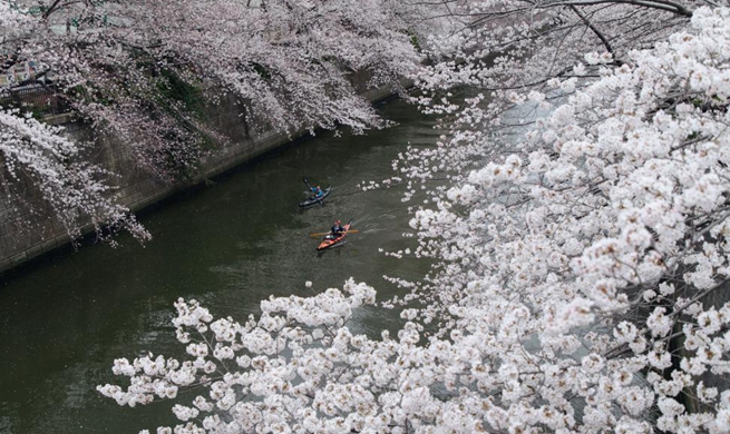 People enjoy view of cherry blossoms along Chidorigafuchi Moat in Tokyo
