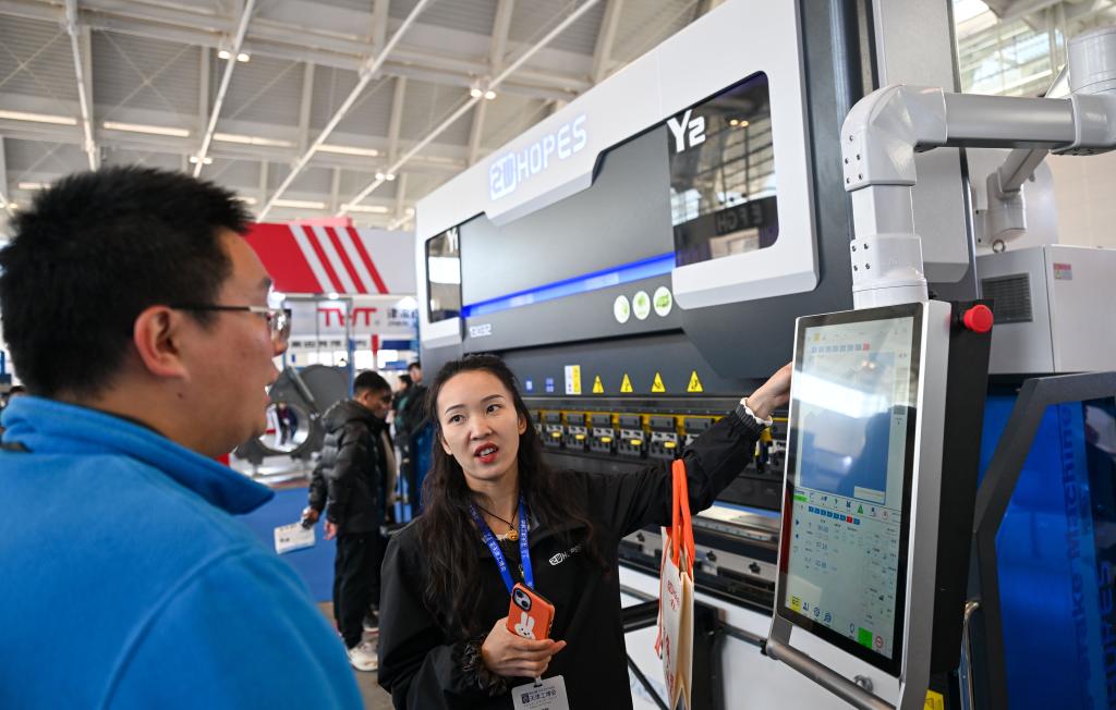 3月18日,参展商向观众讲解一款折弯机设备。