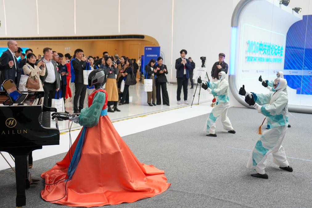 3月25日,在中关村国际创新中心,机器人在演奏乐器,表演舞蹈。