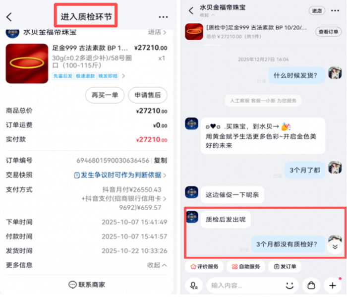 采访中,袁女士向人民网记者出示的订单记录显示:物流状态自去年10月起便停滞在“进入质检环节”,商家失联,抖音平台仅提出“退款并补偿100元”。她尝试联系快递公司核实,发现商家寄往所谓“质检基地”的竟是一份文件,与黄金重量完全不符。