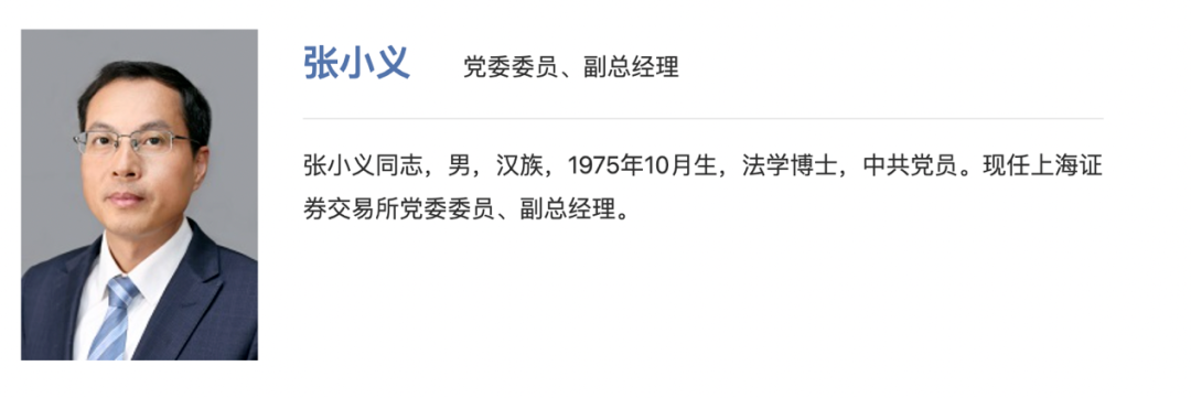 公开资料显示,张小义,男,汉族,1975年10月生,法学博士,中共党员,此前曾担任上交所上市公司管理一部总监、债券业务中心常务副主任等职。
