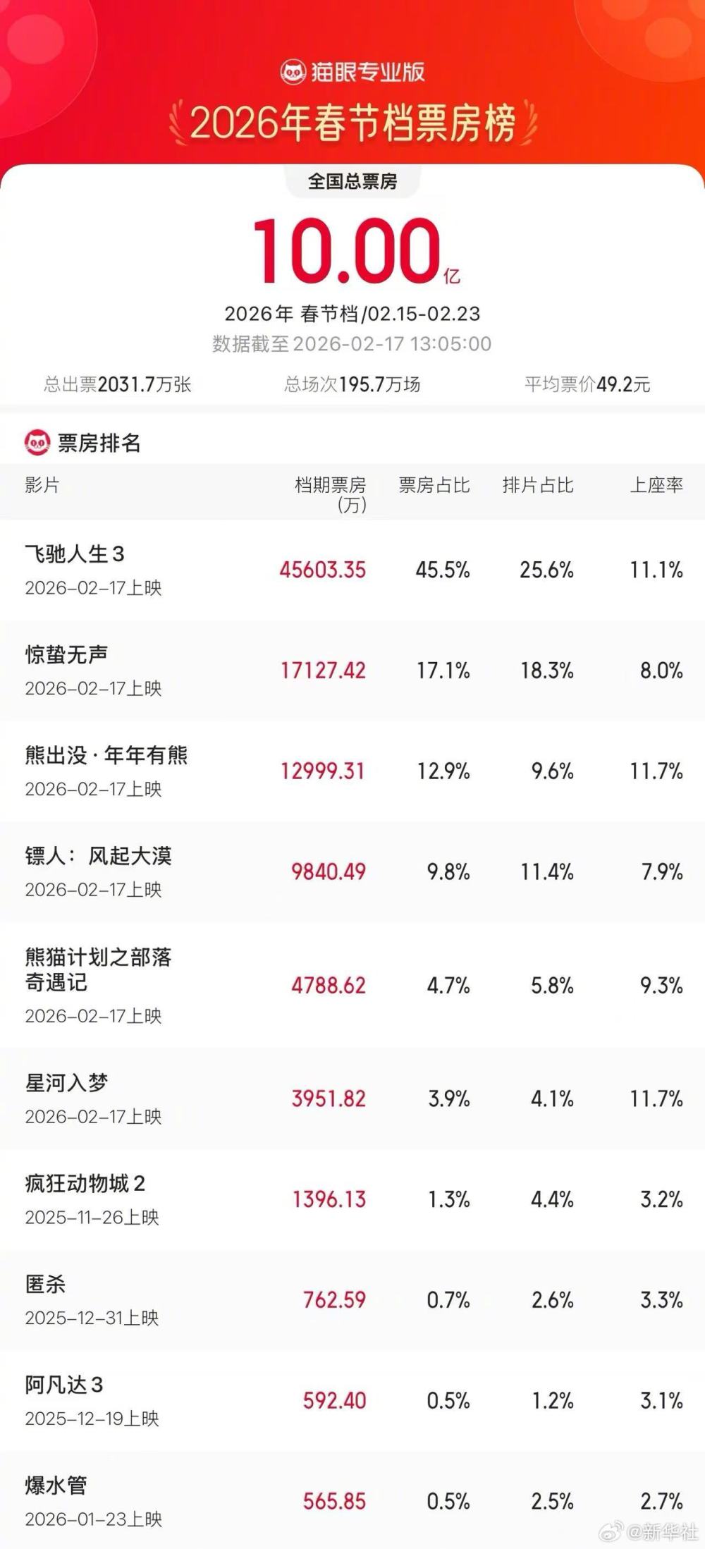 【2026年春节档票房破10亿】据网络平台数据,2026年春节档档期总票房破10亿,《飞驰人生3》,《惊蛰无声》、《熊出没》和《镖人:风起大漠》分列2026年春节档票房榜前四。 一起聊聊,你最期待哪部春节档电影?