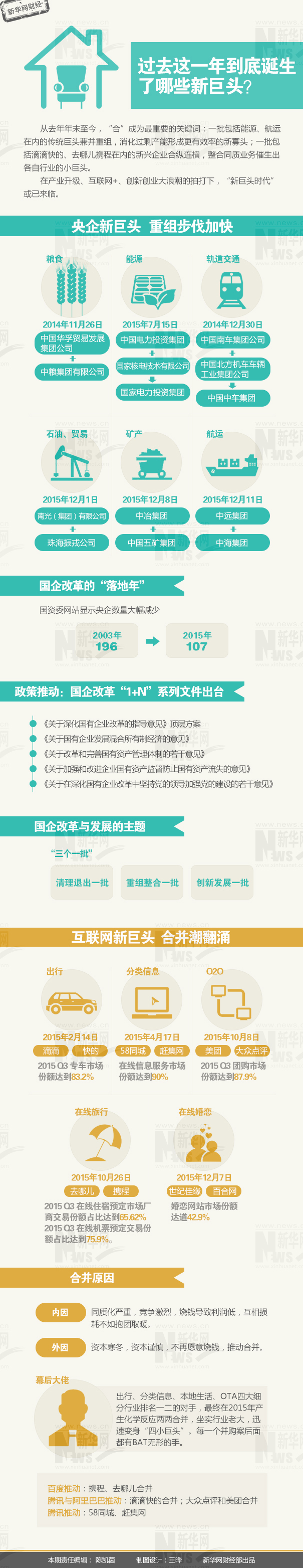 一批包括能源、航運在內(nèi)的傳統(tǒng)巨頭兼并重組,力求消化過剩產(chǎn)能以成為更有效率的領(lǐng)軍者;一批包括滴滴快的、去哪兒攜程在內(nèi)的新興企業(yè)合縱連橫,整合同質(zhì)業(yè)務(wù)催生出各自行業(yè)的小巨頭。