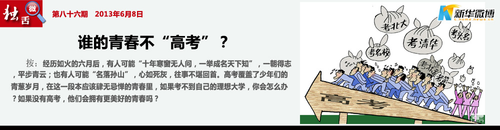 【為經(jīng)濟(jì)做貢獻(xiàn)】 算算高考,用了12年青春,至少四五十萬(wàn)的學(xué)費(fèi),我們養(yǎng)活了晨光廠、真彩廠、機(jī)讀卡廠、無(wú)數(shù)造紙廠、無(wú)數(shù)印刷場(chǎng),翰林書店、新華書店,城市的交通行業(yè),學(xué)校周邊的飯館,以及所有老師的工資獎(jiǎng)金、校長(zhǎng)的車、油錢……高考是國(guó)家支柱型民營(yíng)企業(yè)!這就是我們的功勞!